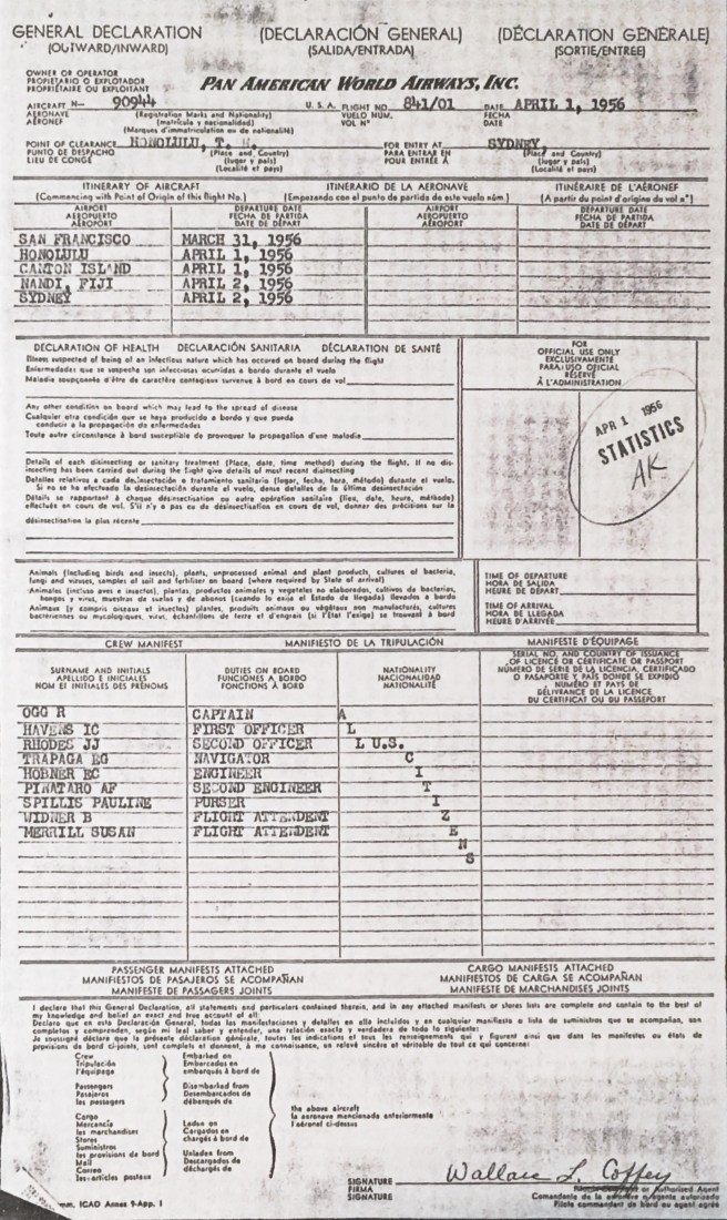 Even this old form has a story to tell. The date is April 1, 1956, about 19 months prior to Albert’s death. The aircraft listed on the form, 90944, is the same Boeing Stratocruiser that killed him (the Clipper Romance of the Skies, pictured above). The itinerary–San Francisco, Honolulu, Canton Island, Fiji and Sydney–is also very similar to the last flight of the Romance of the Skies. On the crew manifest, Pinataro is listed as “Second Engineer,” perhaps indicating this was a training flight for him. Whoever filled out the form (I’m guessing it was the aircraft’s purser) apparently had some fun typing out “All U.S. CITIZENS” under the Nationality column.