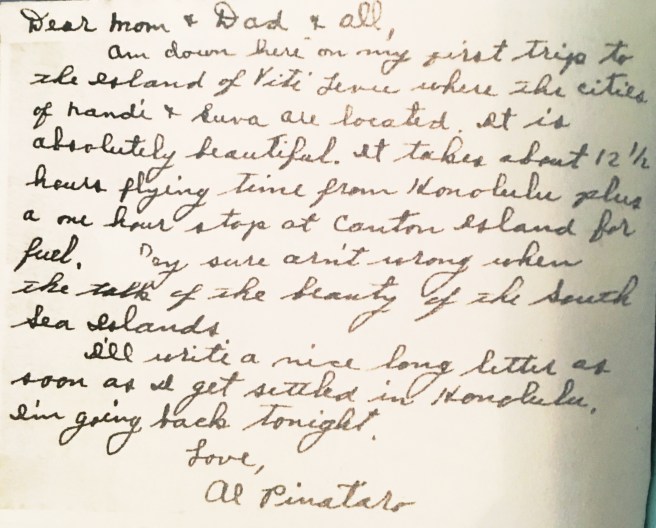 Am down here on my first trip to the island of Viti Levu where the cities of Nandi & Suva are located. It is absolutely beautiful. It takes about 12 1/2 hours flying time from Honolulu plus a one hour stop at Canton Island for fuel. [They?] sure aren’t wrong when the[y] talk of the beauty of the South Sea Islands.